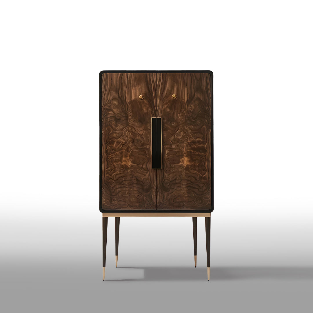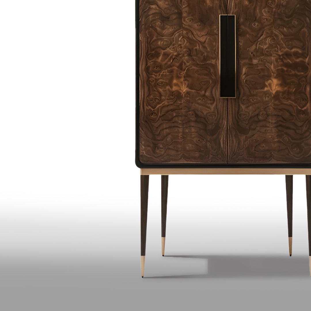 The Nova cabinet showcases exquisite burl veneers, celebrated for their natural patterns that make each piece uniquely beautiful. The deep wood grain is complemented by sleek metallic accents. With customisable internals and finish options, this piece is as functional as it is elegant.